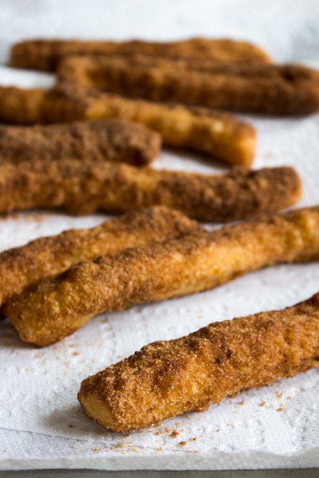 9. Continuer à frire et enrober les churros avec sucre à la cannelle jusqu’à ce que toute la pâte ait été utilisé.