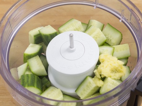 2. Couper le reste du concombre en morceaux d'environ 1 pouce (2.5 centimètres). Combiner le concombre avec le gingembre dans un mélangeur électrique ou un robot culinaire et réduire en purée lisse pendant environ une minute.
