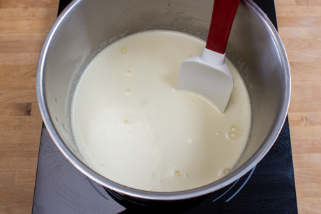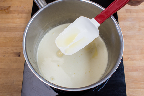 3. Remettre dans la casserole et cuire à feu moyen, en remuant constamment, jusqu’à ce que le mélange épaississe légèrement. Vous pouvez vérifier la cuisson en plongeant une spatule en silicone dans le mélange pour l’enrober complètement. Laissez refroidir légèrement sur la spatule et passez votre doigt sur le mélange. Si la ligne reste en place, le mélange est prêt.