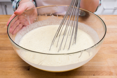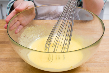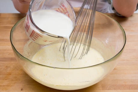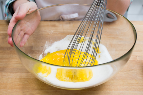 2. Placez les jaunes d’œufs et le sucre dans un grand bol et fouettez jusqu’à homogénéité et que le mélange épaississe légèrement. Versez petit à petit dans la crème, en fouettant constamment. Cela tempère les jaunes d’oeufs (les réchauffer lentement les empêche de cuire).