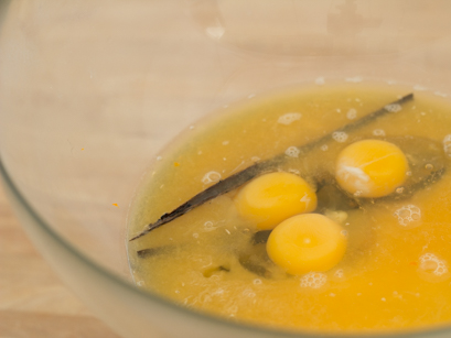 3. Ajouter les œufs, la gousse de vanille et le Sucre Granulé Redpath®et fouetter ensemble. Placer le bol sur un bain-marie.