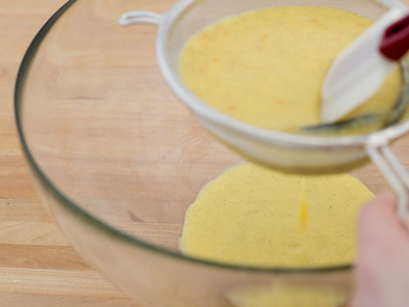 5. Retirer du feu et filtrer à l'aide d'un tamis pour enlever les zestes d'orange, la gousse de vanille(réserver) et les grumeaux.