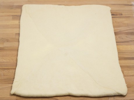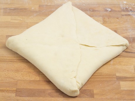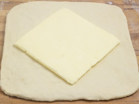 6. Rouler la pâte sur une surface farinée en un carré de 10 pouces (25 centimètres). Retirer le beurre du papier parchemin et déposer au centre de la pâte à un angle de 90° de sorte que les coins du carré de beurre soient allignés avec le centre des côtés de la pâte (voir photo ci-dessous). Rabattre les côtés de la pâte et pincer pour bien sceller.