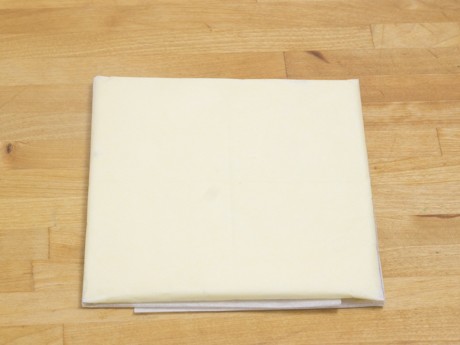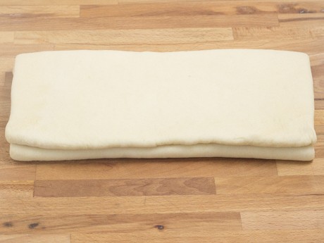 7. Rouler la pâte en un rectangle de 10 x 15 pouces (25 x 38 centimètres) d’une épaisseur de ¼ pouce (6 millimètres). Positionner la pâte de façon à ce que le côté le plus petit soit près de vous (voir photo ci-dessous) et rabattre ⅓ de la pâte puis l’autre ⅓ par-dessus, comme si vous pliez une lettre. Tourner la pâte sur 90° de façon à ce que l’ouverture soit de votre côté droit. Ceci complète le premier tourage de la pâte. Envelopper d’une pellicule de plastique et réfrigérer pendant 30 minutes. Répéter ces étapes deux fois en prenant soin de toujours réfrigérer la pâte. Réfrigérer toute la nuit une fois les trois tourages complétés.