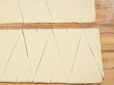 8. Rouler la pâte en un rectangle de 15 x 16 pouces (38 x 41 centimètres). Couper la pâte en deux sur le sens de la longueur de façon à obtenir deux rectangles de 15 x 8 pouces (38 x 20 centimètres). Couper chaque rectangle en six triangles de 8 pouces (20 centimètres) de hauteur et 4 pouces (10 centimètres) de largeur à la base. Faire une incision de ½ pouce (1.3 centimètres) au centre de la base de chaque triangle.