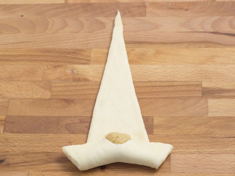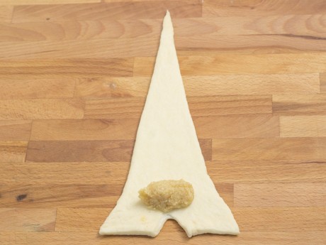 9.Former les croissants en étirant légèrement les coins du côté de l’incision. Déposer 1 cuillère à thé de la garniture aux amandes au-dessus de l’incision. Rouler le croissant en étirant les derniers 3 pouces (7.6 centimètres) et en scellant la pointe en-dessous. Transférer sur une plaque à biscuits recouverte d’un papier parchemin et courber légèrement les extrémités vers l’intérieur.légèrement les extrémités vers l'intérieur.