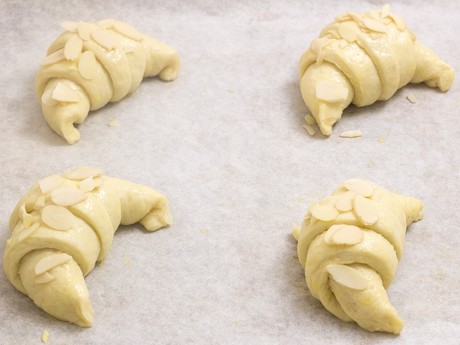 13. Badigeonner les croissants de la dorure et saupoudrer d’amandes effilées.
