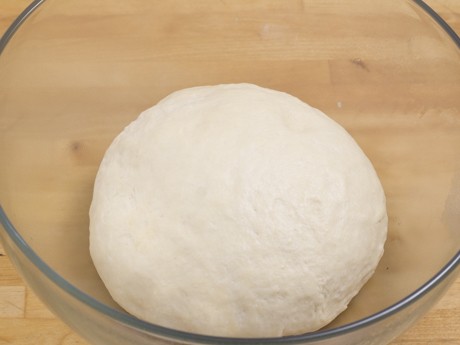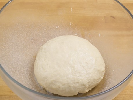 3. Transférer la pâte sur une surface farinée et pétrir quelque coups. Former une boule et déposer dans un gros bol légèrement huilé. Couvrir d’une pellicule de plastique et laisser gonfler jusqu’à ce que la pâte double de volume, environ 60 à 90 minutes.
