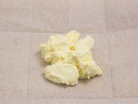 5. Préparer le ¾ tasse (170 g) de beurre pour le tourage. Tracer un carré de 6 pouces (15 centimètres) au centre d’une feuille de papier parchemin d’une longueur minimale de 18 pouces (45 centimètres). Retourner la feuille afin que le trait de crayon soit en-dessous et plier et déplier sur chaque côté du carré pour faciliter l’étape suivante. Déposer le beurre dans le carré tracé et étendre uniformément en respectant les lignes. Rabattre les côtés et rouler à l’aide d’un rouleau à pâte pour obtenir un carré de 6 pouces (15 centimètres). Réfrigérer pendant 20 minutes.