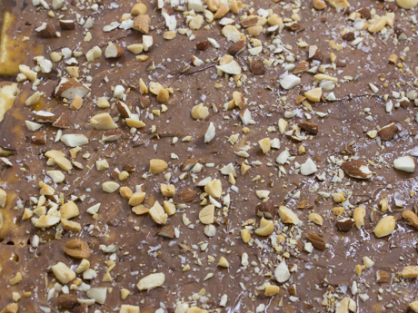 Retirer du four et déposer les brisures de chocolat uniformément par-dessus. Laisser fondre puis étendre à l’aide d’une spatule à glaçage ou d’une cuillère.