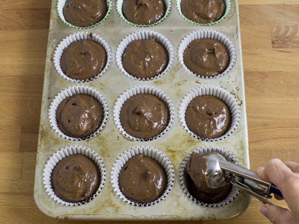 Avec l'aide d'une cuillère à crème glacée à gâchette, remplir chaque coupelle aux trois quarts. Mettre le moule au four préchauffé. Cuire pendant 15 à 20 minutes ou jusqu'à ce qu'un cure-dent inséré au centre d’un cupcake en ressorte propre.