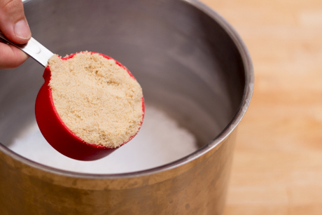 Portez à ébullition le sel, le sucre et quatre tasses d’eau dans un grand chaudron, en remuant fréquemment. Poursuivre la cuisson jusqu’à ce que le sel et le sucre soient dissous.