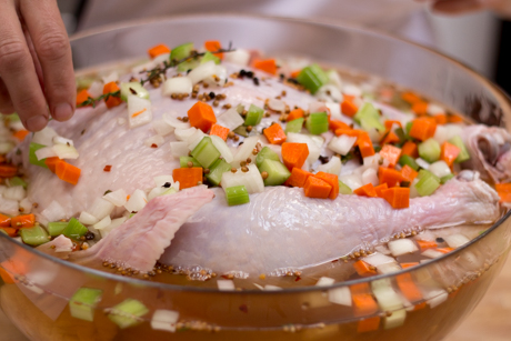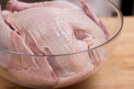 Mettre la dinde dans un bol suffisamment grand, puis versez la saumure par dessus. Ajouter de l’eau froide au besoin afin que la dinde soit complètement recouverte de saumure. Laissez macérer la dinde dans la saumure au moins six heures ou toute la nuit.