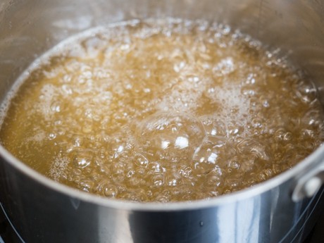 Soyez prudent lorsque vous faites bouillir le sucre. S’il brûle, mettre immédiatement la casserole dans l’évier avec des mitaines de four et NE PAS verser d’eau avant le sucre soit complètement tempéré.