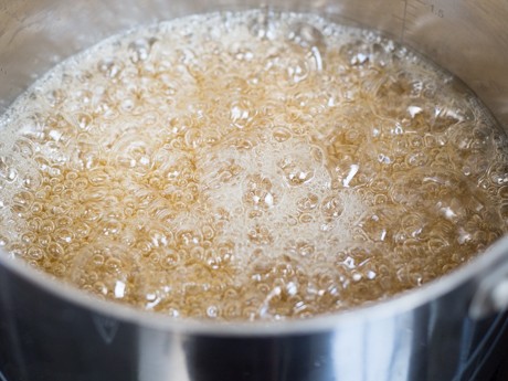 4. Il faut faire bouillir pour se rendre à 300°F-310°F (146°C-154°C) où la concentration du sucre est à 99% et l’eau à 1%. Cette étape arrive quelques secondes avant que le sucre change de couleur et commence à caraméliser. À cette stade, la caramélisation, il n’y a plus d’eau dans le sirop.