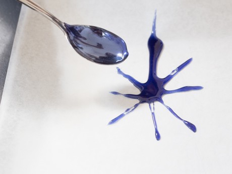 7. En travaillant rapidement avec une longue cuillère, verser le sirop sur le papier parchemin en formant des feux d'artifices (voir photo ci-dessous). Laisser refroidir complètement avant de manipuler et garnir sur des cupcakes ou un Gâteau juste avant de servir.