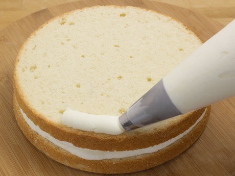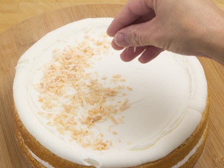 2. Déposer l'un des deux dessous de Gâteau sur le plateau tournant. Remplir une poche à ptisserie munit d'une grosse douille ronde de la crème au beurre. Couvrir de crème au beurre en traçant des cercles et étendre uniformément à l'aide d'une petite spatule à glaçage en laissant le cercle en bordure intact. Saupoudrer de ¼ tasse (15 g) de noix de coco grillée et tracer un cercle de glaçage par-dessus le cercle en bordure.