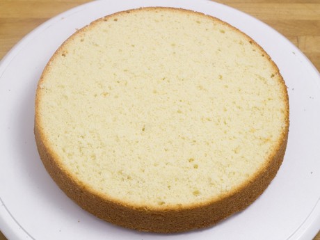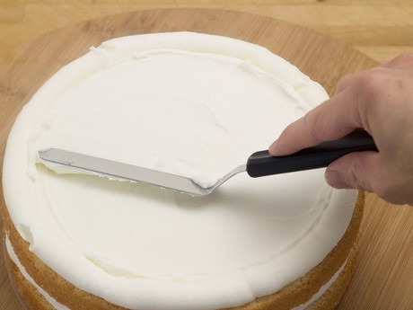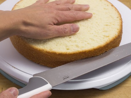 1. Retirer la partie bombée du dessus de chaque Gâteau à l'aide d'un couteau dentelé. Déposer le Gâteau sur un plateau tournant ou une surface confortable pour travailler. Couper le Gâteau en deux parties égales en tournant le plateau pour faciliter la coupe. Répéter pour l'autre Gâteau.