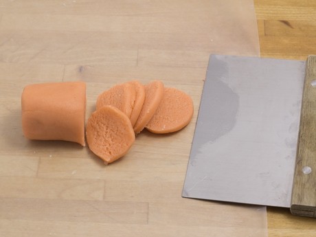 1. Diviser et colorer la pte d'amande en mettant une à deux gouttes de colorant alimentaire en gel à l'aide d'un cure-dent (optionnel). Pétrir la pte jusqu'à ce que la couleur soit uniforme. Rouler en un cylindre de 1.5 à 2 pouces (3.8 à 5 centimètres) de diamètre. Couper cinq rondelles de ? pouce (3 millimètres).