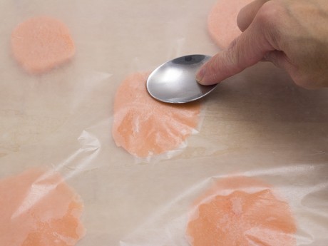 2. Étendre les rondelles entre deux feuilles de papier ciréet à l'aide de vos doigts ou le dos d'une cuillère, aplatir les bordures.