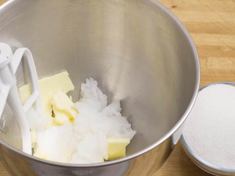 4. Crémer le beurre et l’huile de noix de coco dans le bol d’un batteur sur socle muni du fouet plat. Ajouter le Sucre Granulé Redpath® et mélanger pendant trois minutes ou jusqu’à ce que le mélange pâlisse et devienne mousseux.
