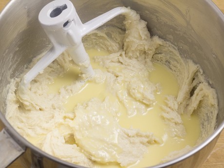 5. Ajouter la moitiédes ingrédients secs en mélangeant à basse vitesse jusqu'à ce que la farine soit presque toute incorporée. Ajouter le reste des ingrédients secs toujours à basse vitesse jusqu'à ce que la farine soit absorbée par le beurre, soit environ une minute. Verser la ½ tasse (120 ml) restante de lait de noix de coco et crémer à vitesse moyenne pendant une minute. Ajouter la préparation d'oeufs en trois additions et mélanger entre chaque addition. Une fois toute la préparation ajoutée, mélanger jusqu'à consistance homogène. Ne pas trop mélanger.