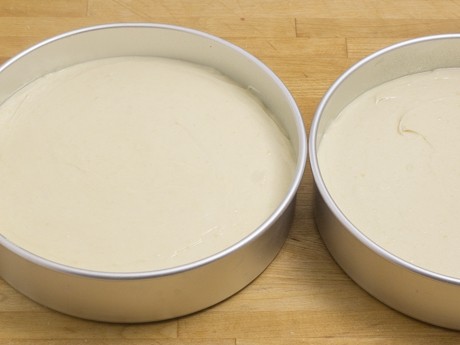 6. Diviser la pte également entre les deux moules préparés et égaliser à l'aide d'une spatule à angle. Cuire pendant 30 à 35 minutes ou jusqu'à ce qu'un cure-dent inséréau centre en ressorte propre. Le Gâteau devrait reprendre sa forme lorsque vous appuyez légèrement dessus.