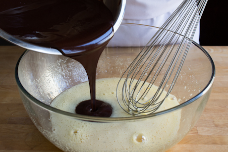 3. Dans un grand bol, fouetter ensemble les œufs et le sucre, puis incorporer dans le mélange de chocolat jusqu'à consistance lisse.