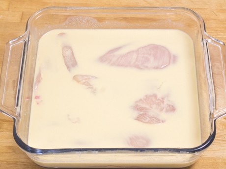 3. Mettre la farine dans un plat profond. Dans un autre plat profond, fouetter le babeurre, l'oeuf, la Cassonade Foncée Redpath® et la moutarde de Dijon.
