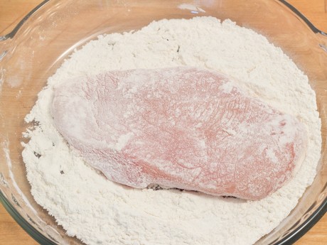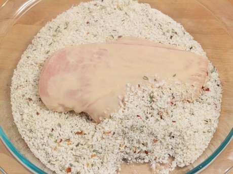 5. Enrober le poulet de farine puis de la préparation de babeurre. Déposer ensuite dans le plat de panko et enrober en appuyant légèrement pour que la chapelure adhère bien. Répéter avec les autres poitrines de poulet.
