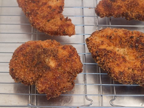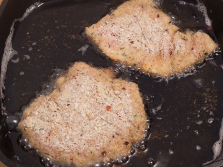 7. Faire chauffer à feu moyen jusqu'à ce que l'huile soit chaude et indique 350℉ (180℃) sur un thermomètre. Si votre poêle est suffisamment grande, faire frire les quatre poitrines en même temps, sinon, faire cuire en deux groupes. Cuire de trois à quatre minutes de chaque côtéou jusqu'à ce que la température au centre atteigne 165℉ (74℃) puis transférer sur un papier essuie-tout.