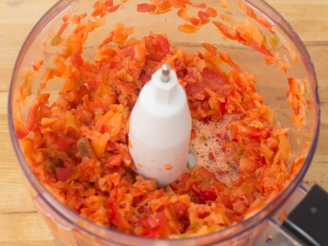 1. Mettre les poivrons dans un robot culinaire et broyez jusqu'à l'obtention d'une texture très fine.