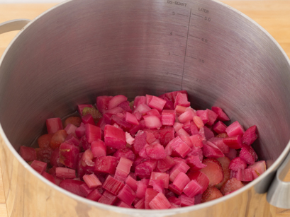 1. Porter à ébullition la rhubarbe, les fraises et l'eau dans un grand chaudron à fond épais. Réduire la chaleur et laisser mijoter 10 minutes. Écumer au besoin avec une louche.
