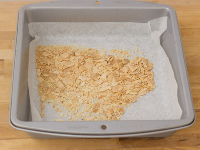 2. Mettre les amandes sur une petite plaque recouverte d'un papier parchemin et cuire au four de quatre à cinq minutes. Laisser tempérer.