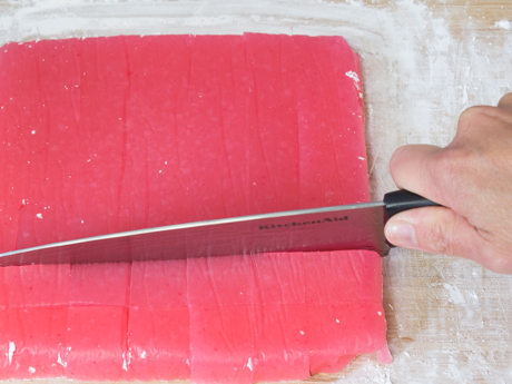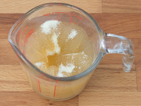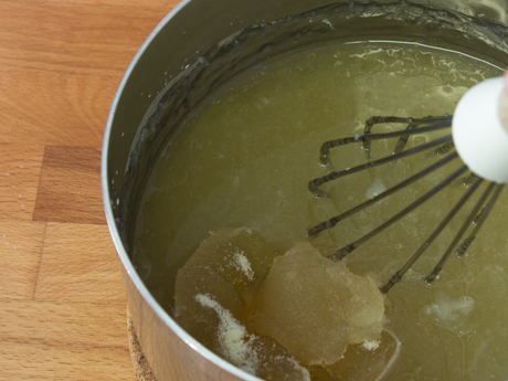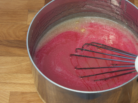Retirer du feu et ajouter la gélatine et deux à trois gouttes de colorant alimentaire rouge ou rose en gel. Remuer jusqu’à ce que la couleur soit uniforme.