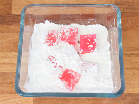 Démouler en tirant et transférer sur une surface de travail légèrement recouverte de l’enrobage. Découper en carrés de 1 pouce (2.5 centimètres) à l’aide d’un couteau enduit d’huile. Mettre l'enrobage dans un plat peu profond et enrober les loukoums.