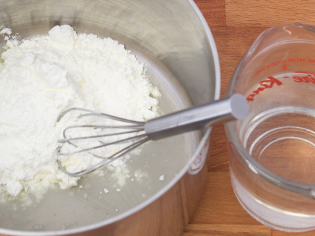 Fouetter la fécule de maïs avec le jus de citron dans une petite casserole. Ajouter graduellement les 200 millilitres d’eau restante et fouetter jusqu’à consistance lisse. Faire chauffer à feu moyen-bas tout en fouettant et cuire jusqu’à ce que la préparation épaississe et bouille, environ trois à cinq minutes.