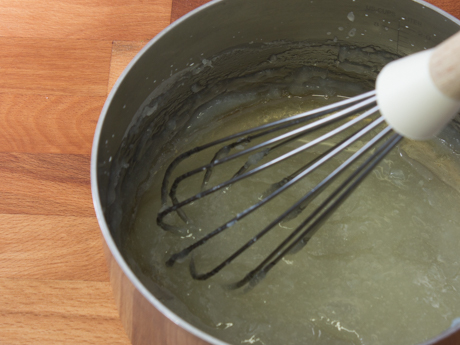 Verser une petite quantité du sirop réservé dans la préparation de fécule de maïs et fouetter. Ajouter graduellement le reste du sirop tout en fouettant et jusqu’à consistance lisse. Baisser le feu à minimum et remuer à l’aide d’une spatule en caoutchouc pendant deux minutes.