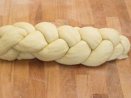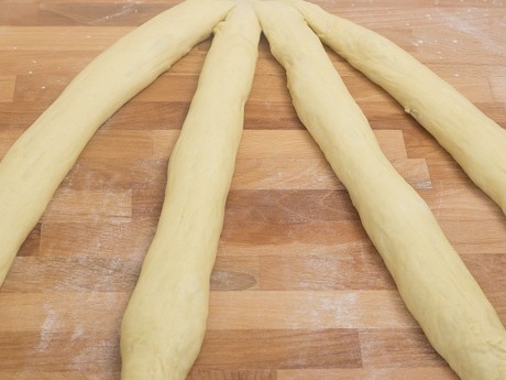 7. Rouler chaque cylindre en une corde de 18 po (46 cm) de longueur et bien sceller le bout de chaque corde ensemble en pinçant. Étendre les cordes de gauche à droite en se souvenant que la corde la plus à gauche est la corde numéro un et celle la plus à droite est la corde numéro quatre. Rabattre la corde numéro quatre par-dessus la corde numéro deux, la corde numéro un par-dessus la corde numéro trois puis finalement la corde numéro deux par-dessus la corde numéro trois. À chaque fois que les cordes sont bougées, vous devez renuméroter vos cordes de un à quatre de gauche à droite. Répéter le processus selon la même combinaison jusqu’à ce que la pâte soit complètement tressée. Sceller le bout en pinçant et rabattre sous le pain pour obtenir une belle finition. Transférer délicatement sur une plaque à biscuits recouverte d’un papier parchemin, couvrir d’une pellicule de platique sans sceller et laisser gonfler pendant 45 minutes.