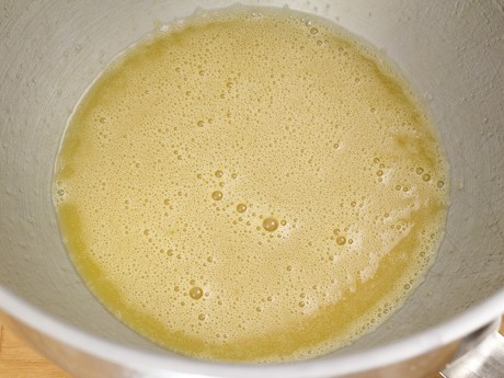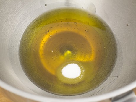 2. Mettre le sucre restant, l'huile d'olive et le sel dans le bol d'un batteur sur socle munit du fouet plat et mélanger à vitesse moyenne-basse. Ajouter les oeufs et les jaunes d'oeufs un à la fois en prenant soin de bien incorporer entre chaque addition. Ajouter la préparation de levure et mélanger pendant 30 secondes.