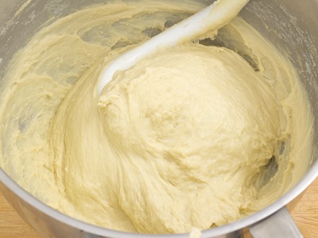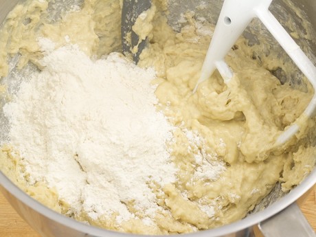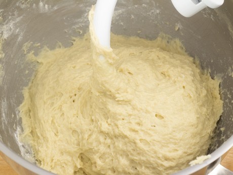 3. Réduire à basse vitesse et ajouter la farine une tasse à la fois. Une fois toute la farine ajoutée, mélanger pendant deux minutes. Changer le fouet plat pour le crochet puis mélanger à vitesse moyenne pendant six minutes. Lorsque prête, la pâte sera élastique et légèrement collante.