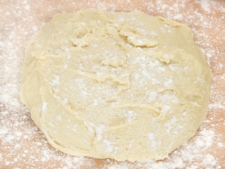 5. Transférer la pâte sur une surface farinée et former un disque d’environ 1 po (2.5 cm) d’épaisseur en appuyant légèrement. Tirer sur un côté de la pâte et rabattre au centre. Retirer l’excédant de farine et rabattre l’autre côté par-dessus (comme si vous pliez une lettre). Tourner la pâte de 90° et répéter le processus. Remettre dans le bol, couvrir et laisser gonfler pendant 30 minutes.