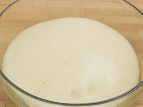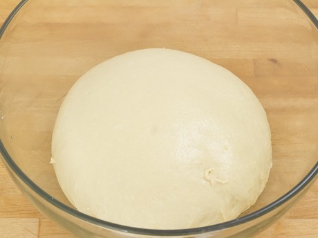 4. Transférer sur une surface légèrement farinée et former une boule. Mettre dans un grand bol légèrement graissé et couvrir d’une pellicule de plastique. Laisser doubler de volume pendant environ 75 minutes.