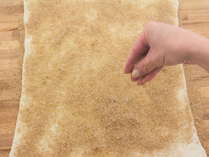 Badigeonner le dessus de la pâte avec le beurre restant puis saupoudrer de la garniture. Presser la garniture dans la pâte.