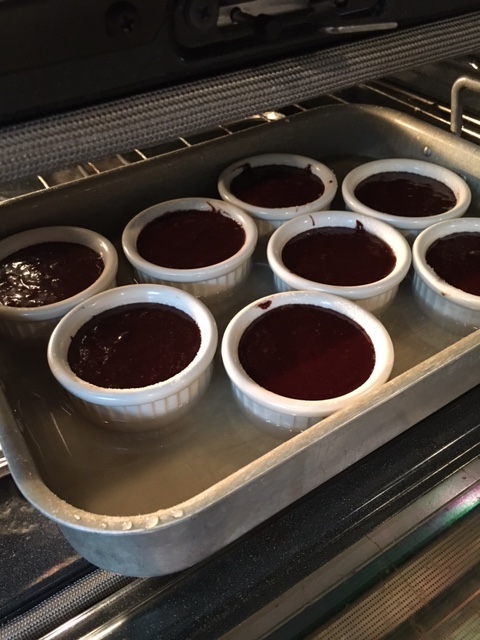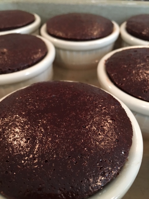 Cuire 30 à 35 minutes, ou jusqu’à ce que les gâteaux gonflent. Le centre doit toujours être un peu moelleux/humide. Laisser les ramequins à température ambiante et retirer avec précaution l’eau chaude. Réserver.