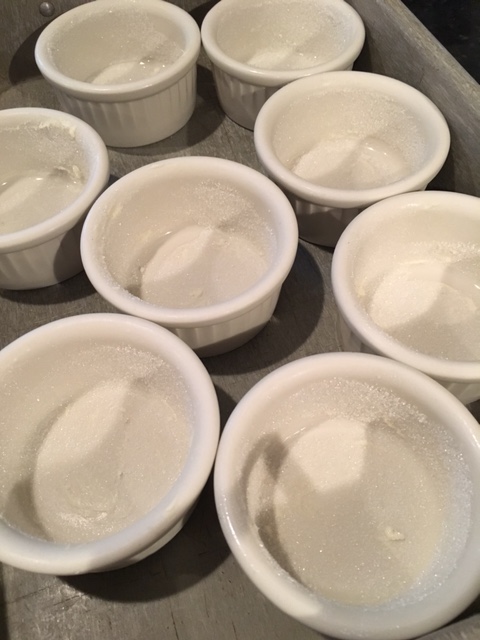 Préchauffer le four à 325°F. Utiliser une cuillère à table de beurre et deux cuillère à table de sucre pour préparer les 8 ramequins. Graisser les moules et saupoudrer de sucre. Secouer pour retirer l’excès de sucre. Réserver.