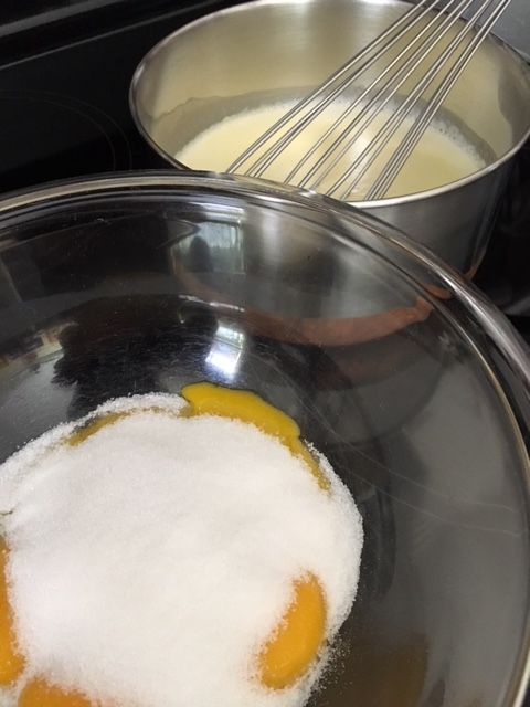 Dans une casserole moyenne, amener le lait et la crème à ébullition. Retirer du feu et laisser refroidir, couvrir. Dans un bol, mélanger les jaunes d’oeufs et le sucre jusqu’à ce que le mélange blanchisse, 3 à 4 minutes.