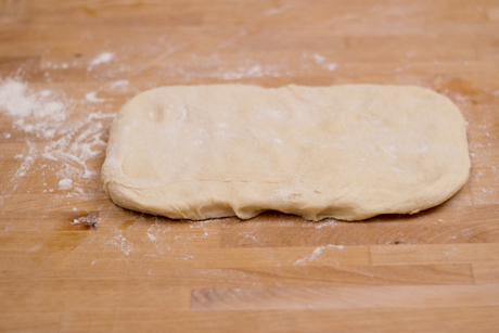 12. En travaillant avec un morceau à la fois , roulez sur une surface légèrement farinée en un rectangle de 12x6 pouces.