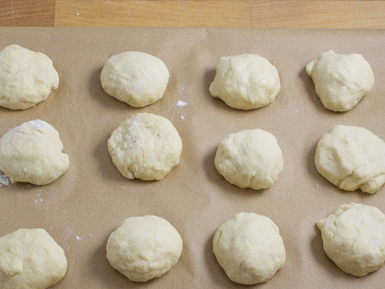Façonner en boules et placer dans le moule graissé. Couvrir d'une pellicule de plastique légèrement graissée. Placer les petits pains dans un endroit tiède et à l’abri des courants d'air le temps de les laisser doubler de taille, de 45 minutes à une heure environ.