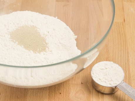 1. Fouetter dans un grand bol 4 ½ tasses (540 g) de la farine à pain et la levure en gardant ¼ tasse (30 g) de la farine.